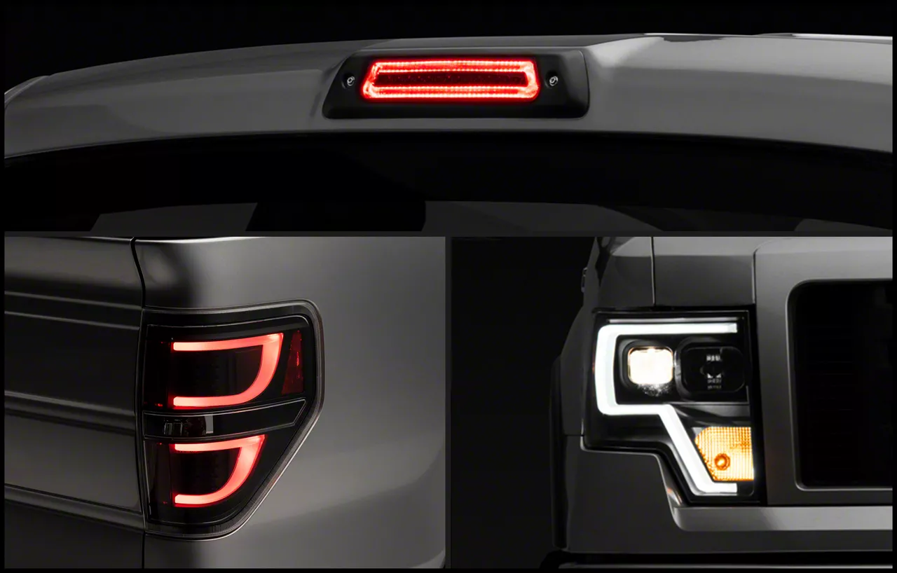 Application. This Raxiom Projector Headlights with LED Accent, G2 LED Tail Lights and Axial Series Smoked LED Third Brake Light; Black Housing; Clear Lens Combo Kit is designed to fit 2009-2014 Ford F-150 Styleside models equipped with Factory Halogen Headlights and Tail Lights, excluding Raptor. Does not fit HID models.