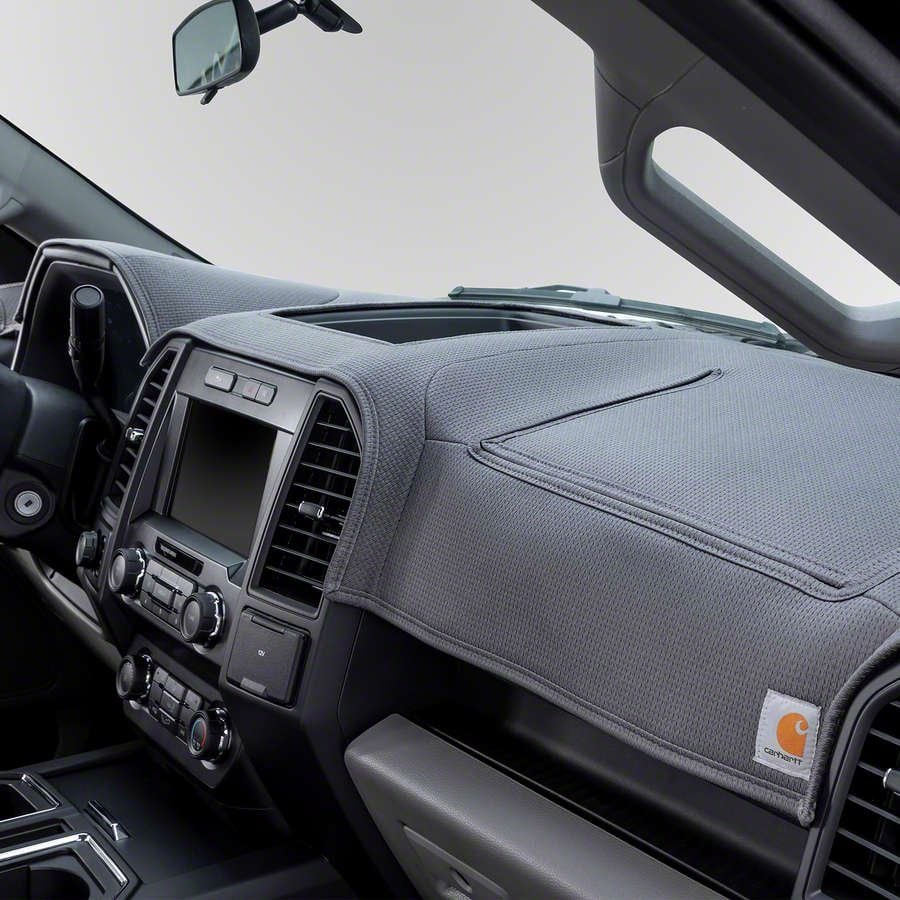 Protection. The F–150 without Forward Collision Alert is specifically made to fit the Covercraft Ltd Edition Custom Dash Cover in Carhartt Gravel. It provides excellent defense against the harmful effects of heat and sun exposure. This protection is essential for maintaining the integrity and beauty of the dashboard because it stops fading, cracking, and warping that can happen over time from continuous sun exposure.