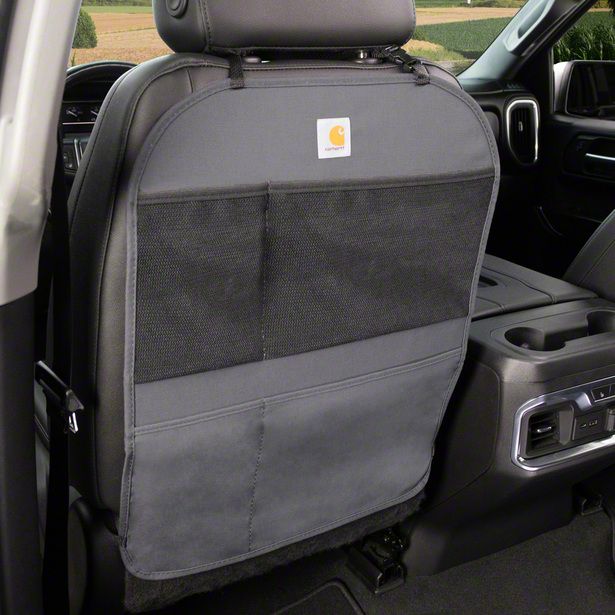 The Carhartt Seatback Organizer enhances your vehicle's storage capabilities while providing rugged protection. Made from durable Carhartt Duck Weave fabric, it shields your seats from stains, mud, snow, spills, and scuffs. With four pockets for added storage—two mesh and two reinforced water-resistant—you can easily organize snacks, toys, tools, and more. Pair with our Carhartt Seat Covers for added protection and storage.