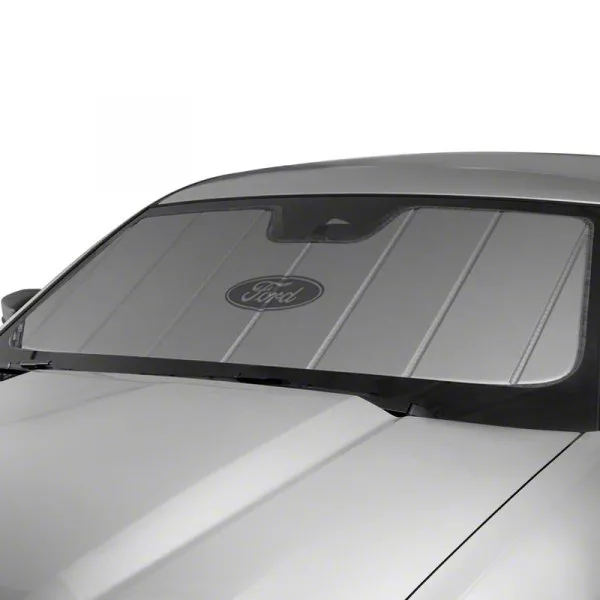 Reliable Sun Protection. Protect your parked vehicle from the intense heat of the sun by installing this Covercraft UVS100 Custom Sunscreen with Black Ford Oval Logo; Silver. This sunscreen helps keep your truck’s interior cool by blocking the sun’s rays with its reflective outer surface. By protecting your vehicle’s interior, its components won’t be easily deformed or damaged by the sun.