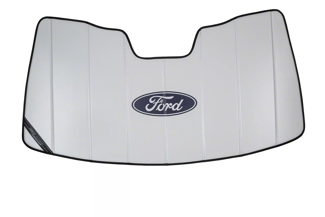 Custom Sun Protection. This Covercraft UVS100 Heat Shield Custom Sunscreen with Black Ford Oval Logo is a premium-quality, custom-fit sunshade designed to protect the interior of your Ford vehicle from harmful UV rays and extreme heat. The shield fits perfectly on the windshield of your Ford F-150 model, blocking up to 99% of harmful UV rays and significantly reducing the amount of heat that enters the cabin. It features the black Ford Oval Logo on a silver background, adding a touch of personalization to your vehicle. The logo is officially licensed by Ford, ensuring its authenticity and quality.