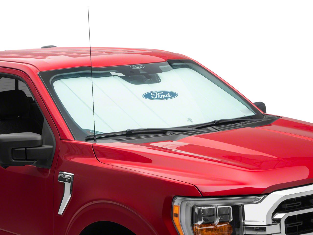 Heat Protection. Save your F-150 from sunlight damage with this Covercraft UVS100 Custom Sunscreen with Black Ford Oval Logo; White. Sporting precision molding, it blocks of your windshield and reflects UV rays back out, instead of having it heat up the insides of your car. This prevents fading and heating on the surface of your interior which often happens to outdoor parked cars.