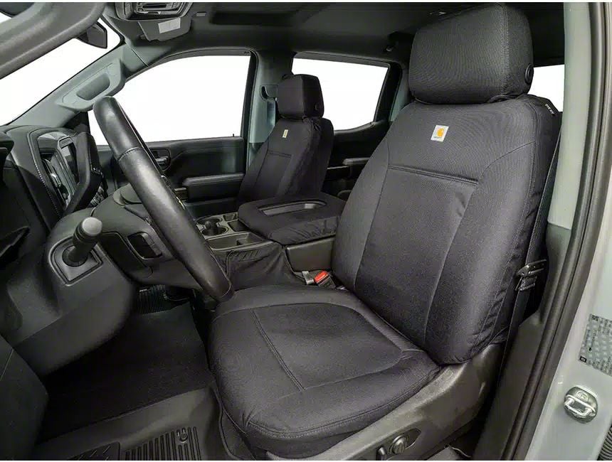 Seat Guard. Protect your seats without sacrificing style with the Covercraft Carhartt Super Dux PrecisionFit Custom Front Row Seat Covers in Black. This front-row seat covers shields your factory seats against the heat of the sun, dirt, and the results of frequent use. It has hidden tear-away stitching for the seat airbag to guarantee your safety will be compromised. These covers are also custom-made following your seat’s dimensions to ensure a perfect fit and professional finish.