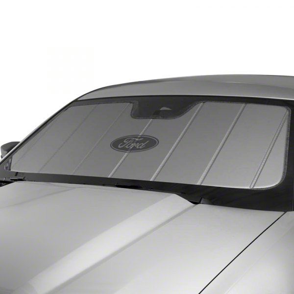 State-of-the-Art Design. The Covercraft UVS100 Custom Sunscreen is the perfect way to keep your car protected from the sun. This sunscreen features a Black Ford oval logo and a silver finish that will look great on any car. The accordion folding design makes it easy to store and the triple laminate construction ensures that it will last for years.