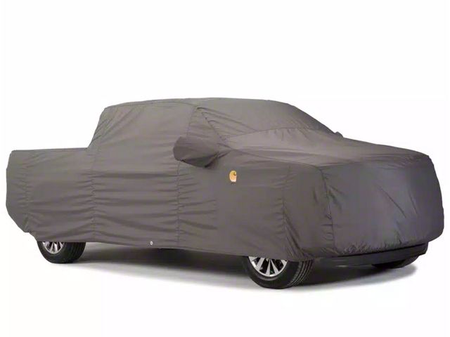 Signature Quality. The Covercraft Work Truck Cover; Carhartt Gravel proudly displays the iconic Carhartt logo on its side and tailgate. This prominent branding not only adds a bold visual statement but also unequivocally signals the cover's premium quality and superior craftsmanship.