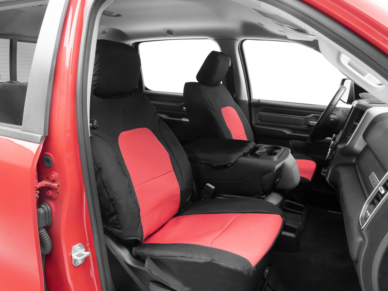 Application. This Covercraft Precision Fit Seat Covers Endura Custom Front Row Seat Covers (Red/Black) fits all 2019-2026 RAM 1500 models with Bucket Seats.