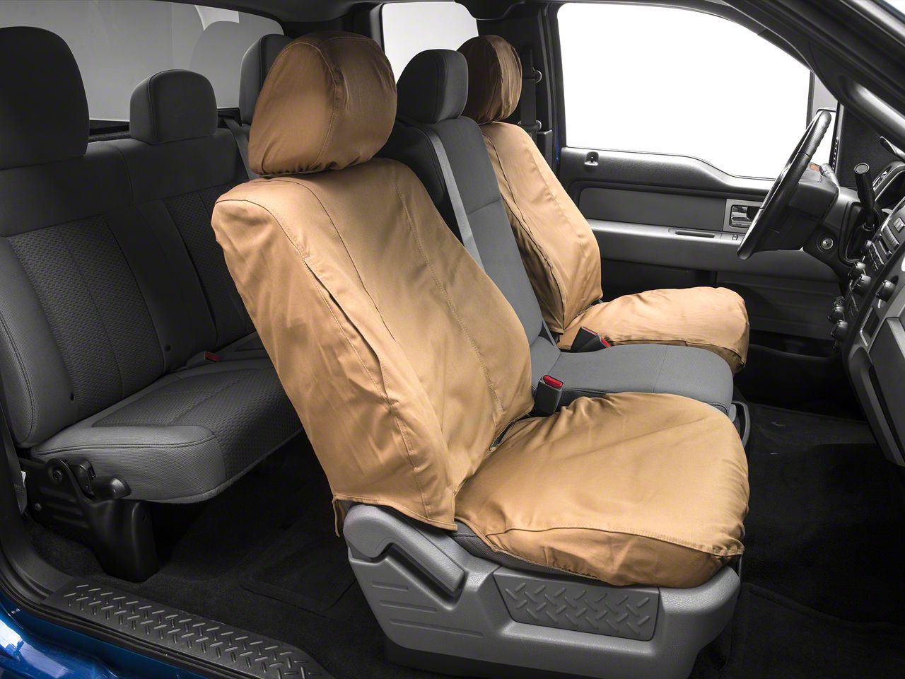 Application. This Covercraft Seat Saver Front Seat Covers in Tan is specifically design to fit on all 2009 to 2014 Ford F-150s with Buckets Seats with adjustable headrests and seat air bags.