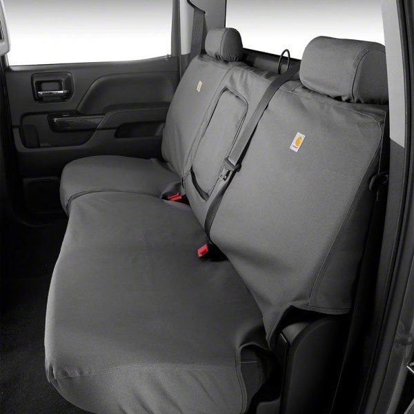 Stylish Seat Protection. Whether you're seeking to refresh your interior or protect your seats from everyday wear and tear, the Covercraft SeatSaver Custom Second Row Seat Cover in Carhartt Gravel is a stylish upgrade you can count on. This second-row seat cover is custom-made to seamlessly fit your specific vehicle, ensuring a precise and tailored look. The Carhartt Gravel color adds a touch of style and sophistication to your vehicle's interior, elevating its overall aesthetic appeal.