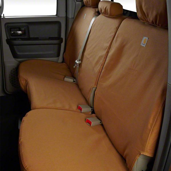 Construction and Appearance. Made from Carhartt Duck Weave fabric in brown, this seat cover features heavy-duty, water-resistant materials. The triple-stitched main seams ensure long-lasting quality and a perfect fit for your vehicle's seats.