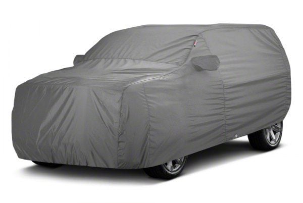 Construction and Appearance. Crafted from solution-dyed acrylic Sunbrella fabric, this cover features a soft underside that is gentle on your vehicle’s finish while resisting rot, mildew, and fading. The cover is custom-tailored to fit precisely, including fabric integration for roof racks and mirror pockets, presented in a sleek gray color for both aesthetics and functionality.