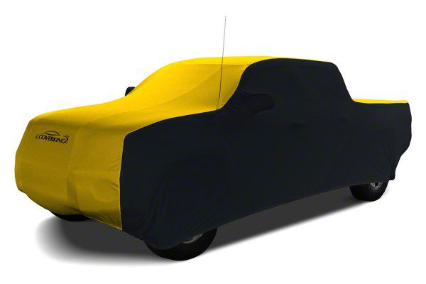 Coverking Satin Stretch Indoor Car Cover with Roof Shark Fin Antenna Pocket; Black/Velocity Yellow (19-26 RAM 2500 Crew Cab w/ 6.4-Foot Box)Find parts that fit my vehicle