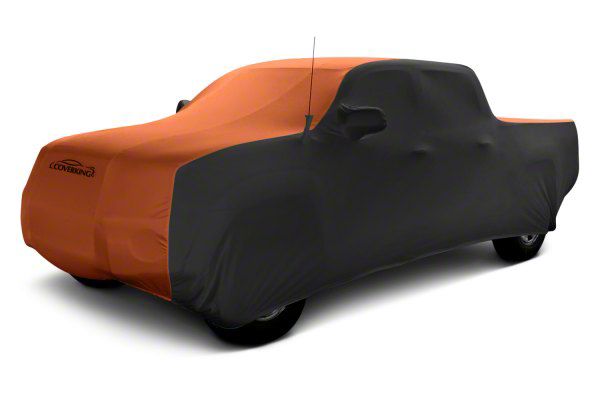 Description. Car Cover; Custom Vehicle Cover Satin Stretch; 2-Tone Black Sides Inferno Orange Center