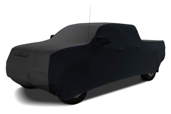 Description. Car Cover; Custom Vehicle Cover Satin Stretch; 2-Tone Black Sides Dark Gray Center