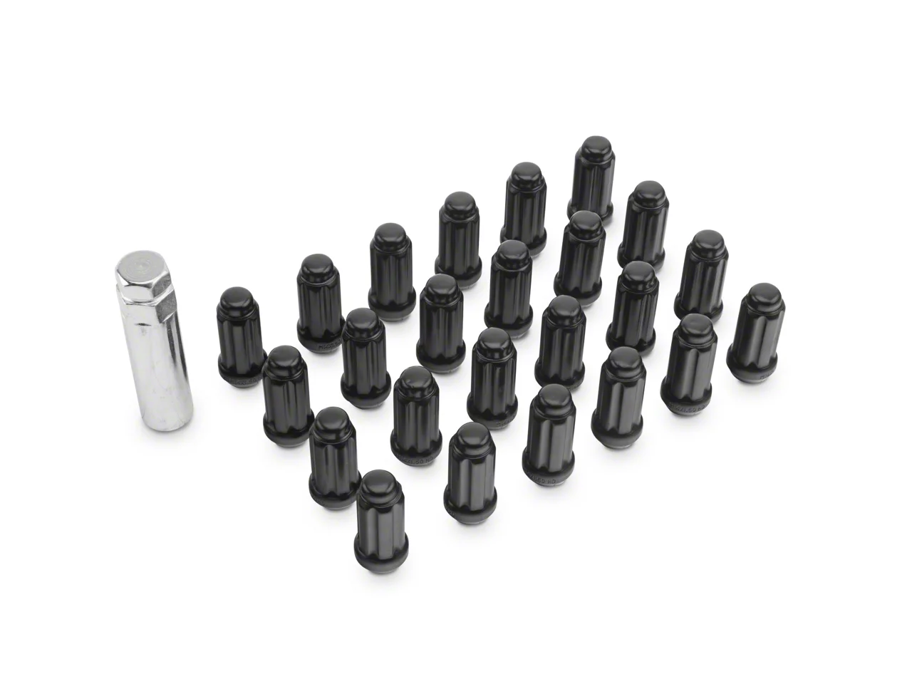 Secure Your Wheels. Keep your wheels safe from theft and impart a tough look to your RAM with this Coyote Black 6 Spline Lug Nut Kit; 14mm x 1.50; Set of 24. This kit comes with 24 lug nuts measuring 14 millimeters by 1.50 inches, and it includes a socket key for convenient removal.