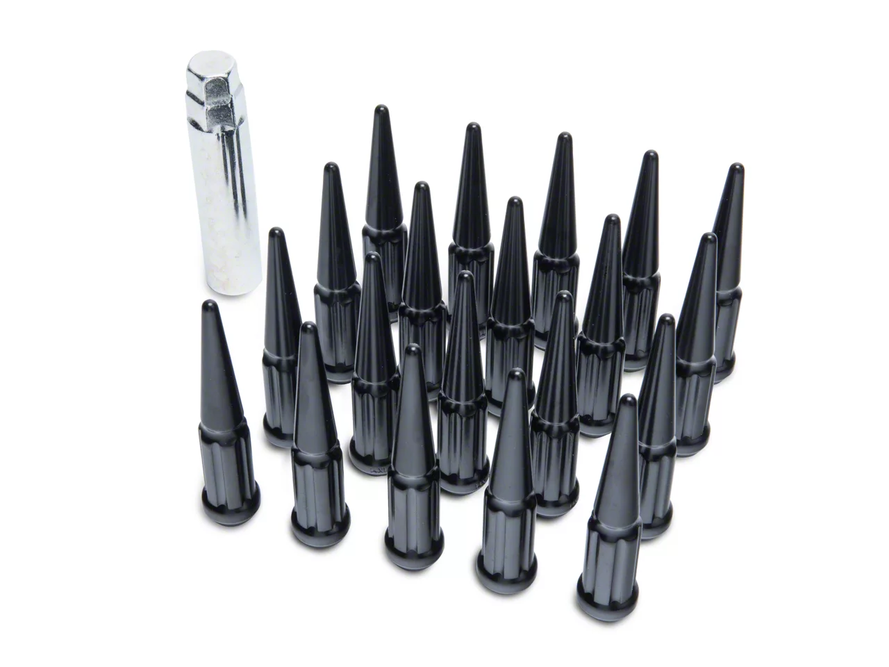 Aggressive Style for Your Wheels. Impart an aggressive look while securing your wheels with this Coyote Black Spike Lug Nut Kit - 9/16 Inch. These lug nuts are 1.90 inches long and have a 9/16 inch thread size. Like all Coyote products, this lug nut kit is manufactured to high-quality standards.