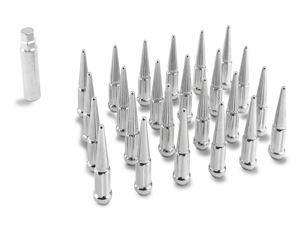 Style Boost With Security. The striking spikes give your truck a stunningly powerful styling that befits its rugged exterior. These chrome lug nuts appealingly enhance the modern, aggressive wheel styles and complement refined wheel designs. In addition, each lug nut is furnished with a spline drive socket that requires a special key, offering extra security to your wheels.