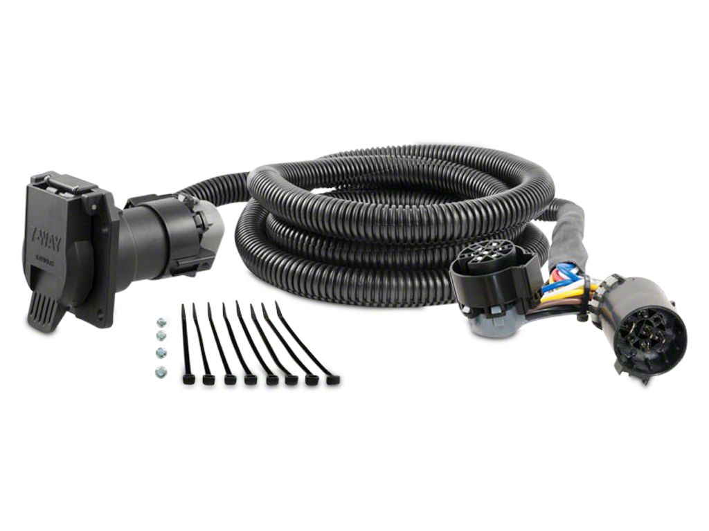 Designed to be Handy. The Custom Wiring Harness with 7-Way Connector neatly contains all the wires inside a protective split loom sleeve. It makes use of a 10-foot extension with a right-angle plug to ease installation. Made with a plug-and-play layout that removes the need to splice, cut, or otherwise modify wiring, this component is manufactured in the United States and comes with a 1 year limited warranty.