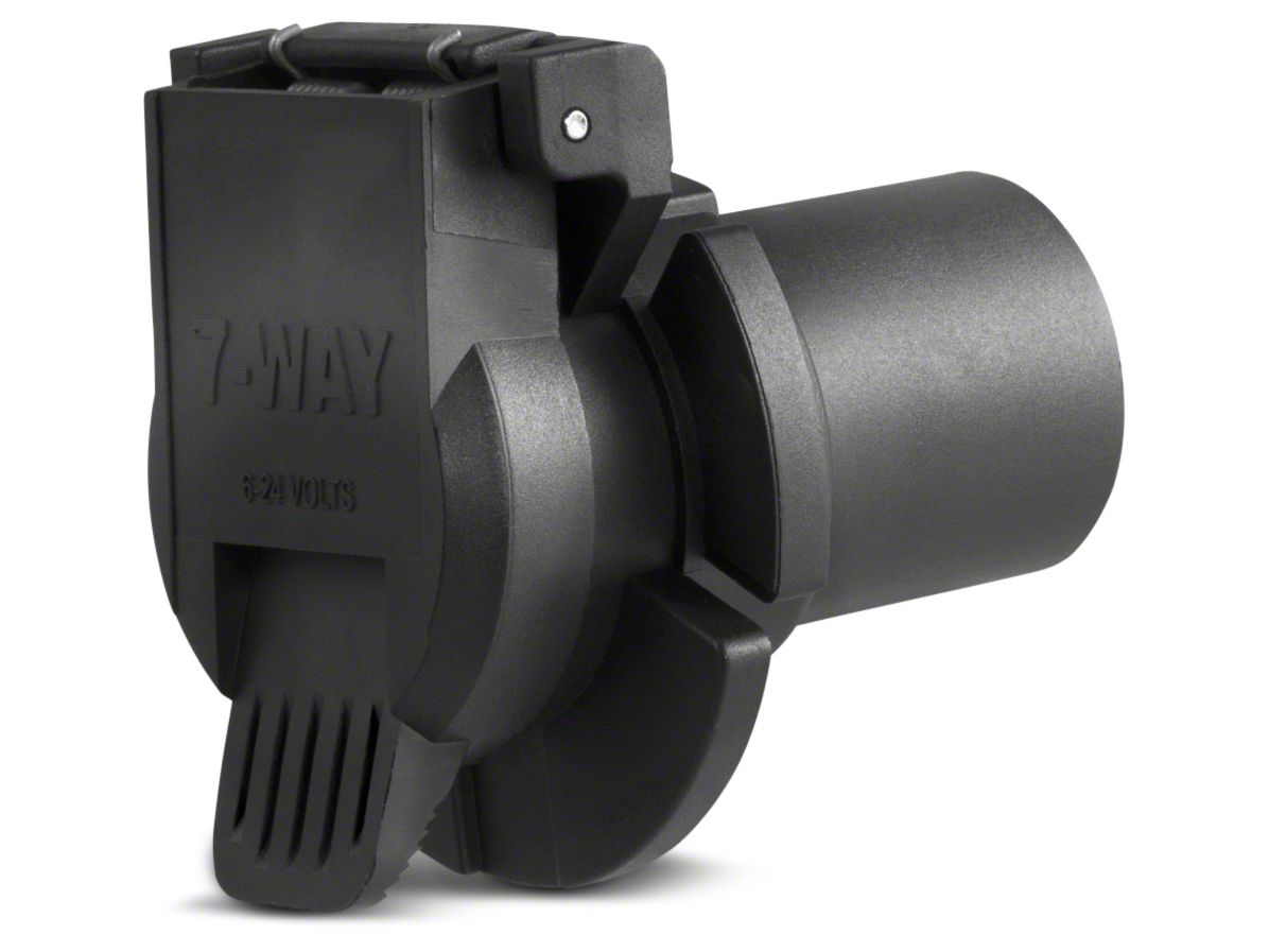 Rust-Proof Design. The 7-Way Twist-In Socket is entirely rust-proof, since it is made of tough black plastic. Its twist-in design means that no hardware is needed for installation. This is a female-end 7-way RV blade connector.