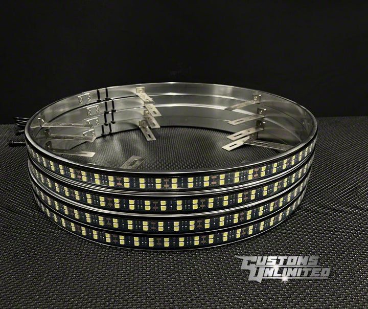 High-Performance Wheel Lights. The Customs Unlimited Double Row Pure White Wheel Lights provide a stylish, high-output lighting solution for your vehicle. Offering pure white LED illumination with breathing and strobing effects, these lights deliver both performance and an aesthetic upgrade. They are perfect for enhancing visibility and making a bold statement on any road.