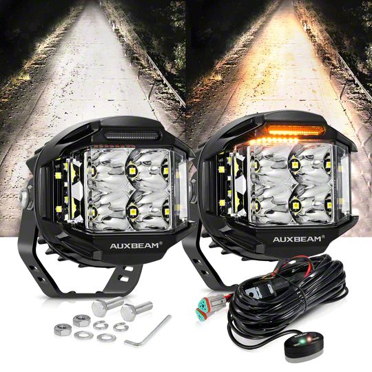 Safety and Style. Introducing our 4-Inch Round Side Shooter LED Pod Lights with Amber DRL (Combo Beam) - the ultimate lighting solution for all your off-road adventures. This pair of Side Shooter LED Pod Lights is designed to provide unparalleled visibility in any terrain. With dual side lights and a powerful front spot light, these pod lights offer superior nighttime illumination, ensuring you can conquer the darkest trails with confidence. These lights also feature an integrated Amber DRL (Daytime Running Light) and a Combo Beam pattern for enhanced visibility during the day and a focused beam for precision lighting at night.