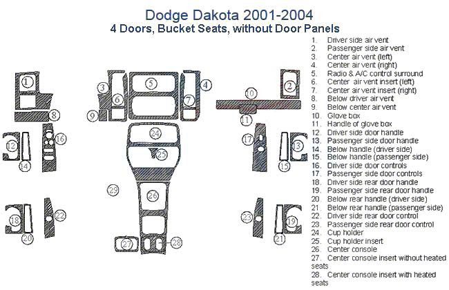 High quality dash trim kit in Zebra Rosewood finish. This is flat two-dimensional (not molded) dash trim kit. It is not a replacement of your existing dashboard. The parts are installed on top of the corresponding areas of vehicle dashboard. Compatible only with Dodge Dakota 2001 2002 2003 2004 4 Doors, Bucket Seats.