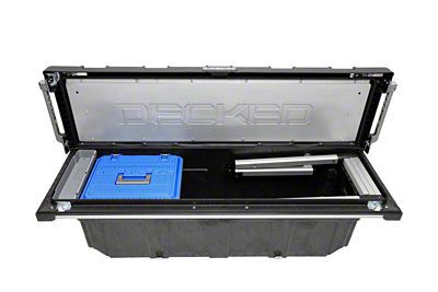Description. The DECKED Tool Box innovates truck bed storage. Made from high impact polymer resin and anti-corrosion treated steel hardware, the DECKED Tool Box is dent-proof, completely waterproof and built to last. Featuring an integrated and optional telescoping access ladder, it's the only toolbox whose contents can be accessed without climbing into the bed of the truck. Featuring robust security mechanisms actuated by a single keyed lock on the driver's side, contents are secured behind multiple layers of resin and steel. With it's low profile design, the view out of the rear window is nearly uninhibited for safety. Comes standard with a DECKED Snack Tray and DECKED D-Box for additional organization.