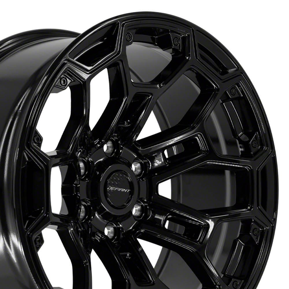 This 20x9 Defiant Wheels DF03 Gloss Black 6-Lug Wheel; 20x9; -12mm Offset is completed in a high-quality gloss black finish that will make everyone take notice. For added looks and strength, the wheel features a durable clear coat that withstands the rigors of daily driving.