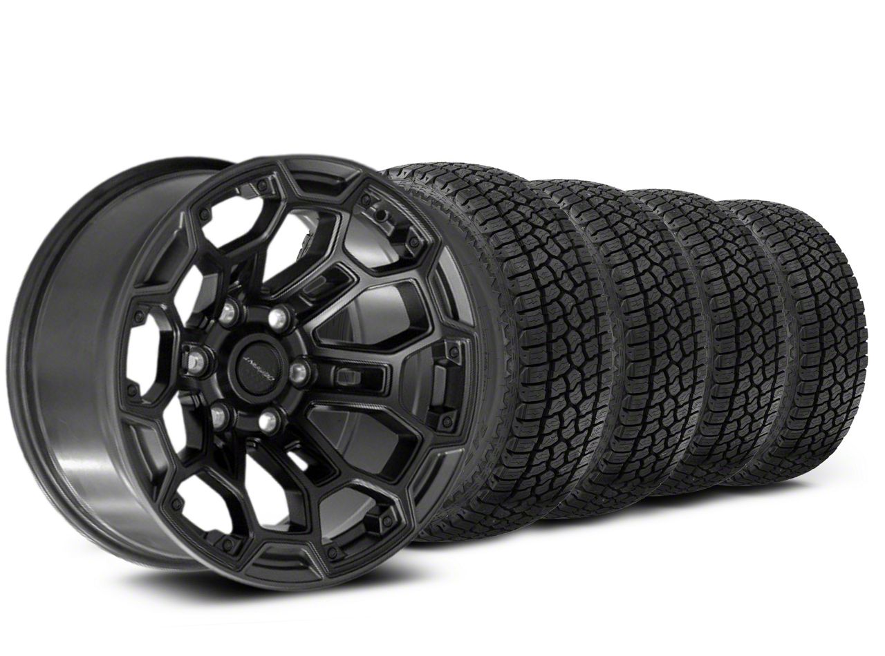 Mounted and Balanced Wheel and Tire Kit. This wheel and tire combo kit features (4) 18x9 Defiant Wheels DF03 Satin Black and Dark Satin Charcoal 6-Lug Wheels and (4) Milestar All-Terrain Patagonia AT/R 33" - 275/70R18 tires that have been put together into an easy to buy kit that arrives to your door already mounted and balanced ready to be installed on your vehicle.