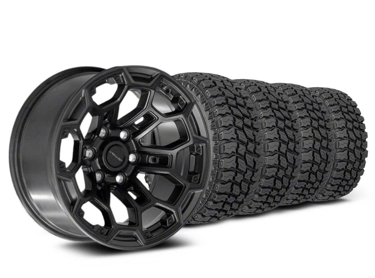 Mounted and Balanced Wheel and Tire Kit. This wheel and tire combo kit features (4) 18x9 Defiant Wheels DF03 Satin Black and Dark Satin Charcoal 6-Lug Wheels and (4) Mudclaw Mud-Terrain Comp MTX 33" - 275/70R18 tires that have been put together into an easy to buy kit that arrives to your door already mounted and balanced ready to be installed on your vehicle.