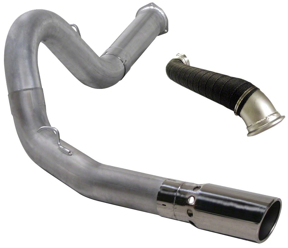 Construction and Features. Featuring a raw metal finish, this exhaust system is crafted from 5-inch aluminized steel tubing, ensuring durability and resistance to corrosion. The system includes a polished tip and a turbo direct pipe for optimal performance. The single passenger side-after tire exit design provides a sleek and efficient exhaust flow, contributing to better sound and performance. This exhaust system is a direct replacement, ensuring a perfect fit and seamless integration with your vehicle’s existing exhaust components.