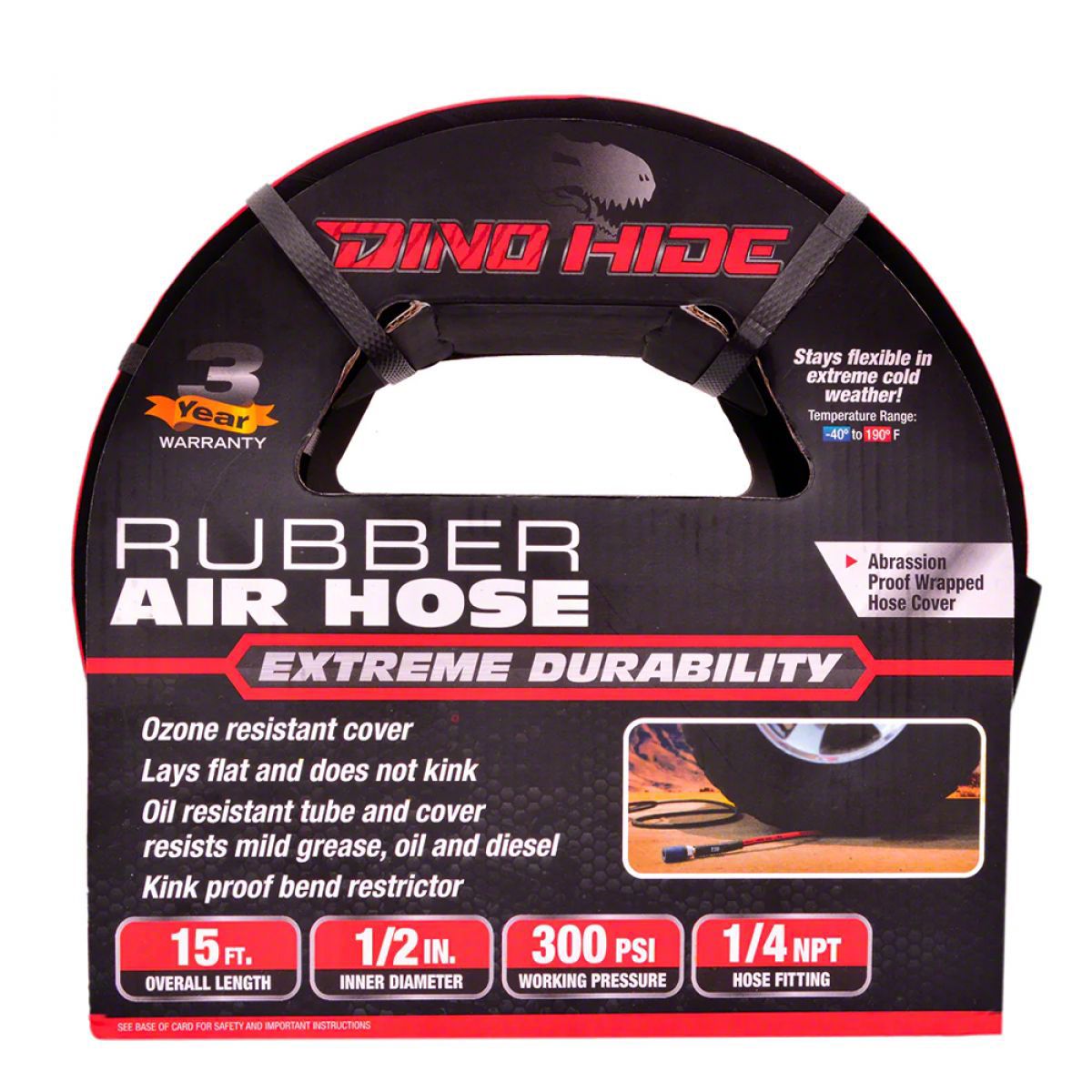 Industry leading 3-year Warranty. Dino-Hide Heavy-Duty Pro-grade wrapped 15' rubber air hose - the ultimate short extender hose designed for professionals in automotive, construction, and industrial applications. This hose is ideal for supplying compressed air to pneumatic tools and inflation accessories. The hose with wrapped finish is high strength, versatile & oil resistant rubber tube. Made up of abrasion, weather & ozone resistant EPDM rubber cover, it exceeds RMA 4:1 safety factor & RMA Class 'C' oil resistance. Bend-restrictor sleeve prevents damage near ends.