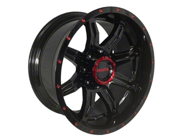 The 20x10 Disaster Offroad D02 Gloss Black with Candy Red Milled 6-Lug Wheel is completed in a high-quality gloss black finish with contrasting accents. There's a durable clear coat that looks amazing and protects the wheel against the rigors of driving.
