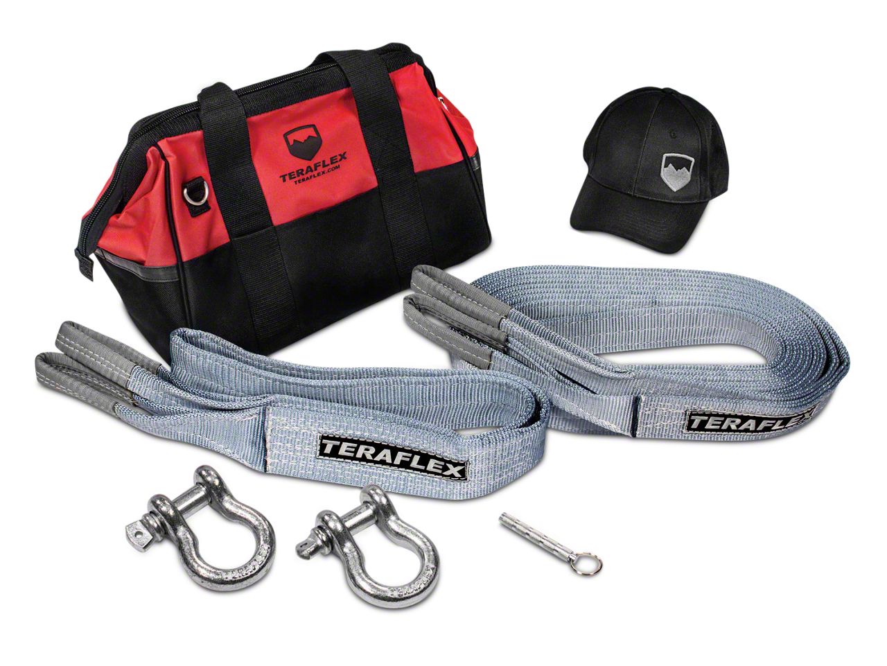 All of the Necessities. This recovery kit features a heavy duty, red tool bag, 7-foot tree strap with 20,000-pound rating, 30-foot tow strap with a 20,000-pound rating, two D-Ring shackles, a baseball cap, and a keychain deflator. This is a valuable must-have kit for any outdoor enthusiast, at an incredible price.