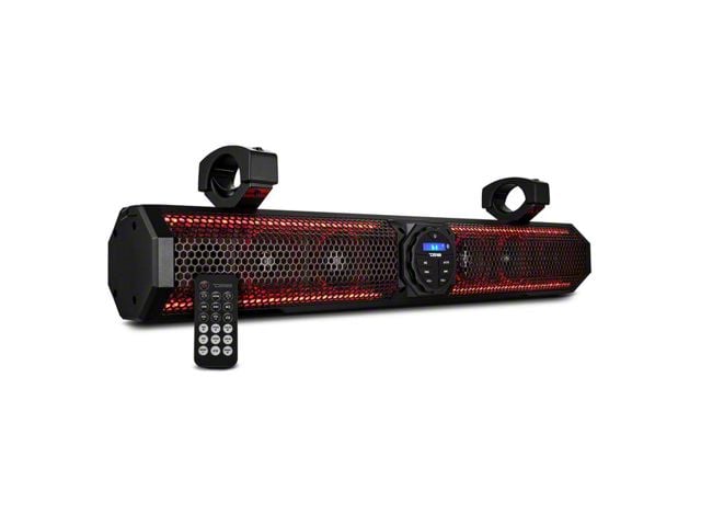 Construction and Appearance. This soundbar is built to withstand the harshest environments, featuring a durable IP35-rated housing. Its adjustable RGB LED lighting and backlit display add a stylish touch, while the rugged construction ensures it can conquer the elements with ease.