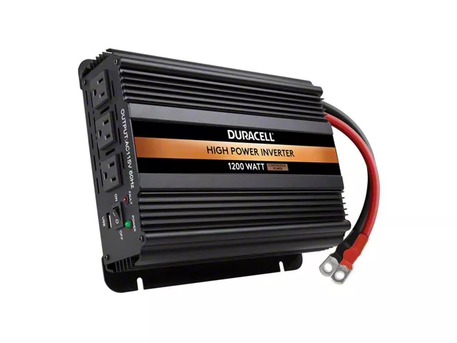 1200W Ultra High Power Inverter. Convert your vehicle's DC power into household AC power with the Duracell 1200-Watt High Power Inverter. Charge AC and USB devices simultaneously with 3 AC outlets and 2 quick charge USB ports. The LED power/fault lights let you know if any errors have occurred so you can adjust and get back to charging quickly. Threaded terminals for securely attaching power cables (included). The Duracell high power inverter works with smartphones, tablets, laptops, TVs, power tools, blender, sump pump, coffee maker and more. Perfect for camping, tailgating, and on the go power.