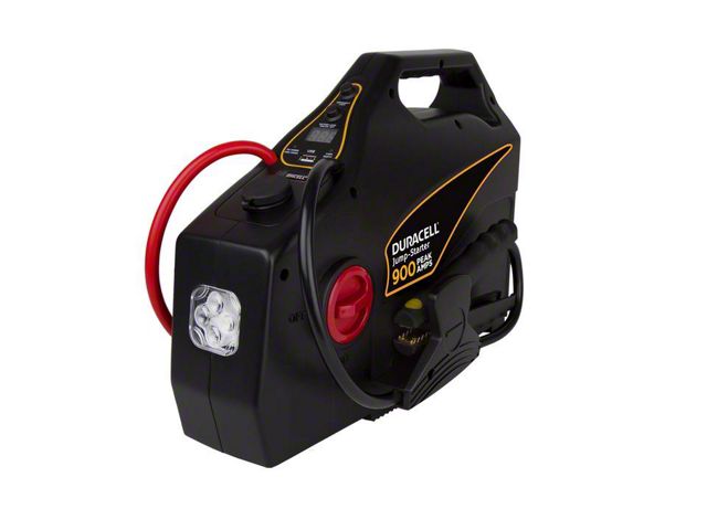900 Peak Amp Output. Never get stranded with Duracell's Portable Emergency Jump Starter. This Jump Starter delivers up to 900 Amp of peak power thanks to its internal rechargeable 12 Ah battery. The LED fuel gauge/battery level indicator conveniently shows the battery fuel level, so you always know when you need to re-charge. You can re-charge with the included AC battery charger. Included are built-in color-coded copper-clad 6 AWG jumper cables. RED: positive jump starting clamp that connects to the positive terminal. BLACK: negative jump starting clamp that connects to the engine block.