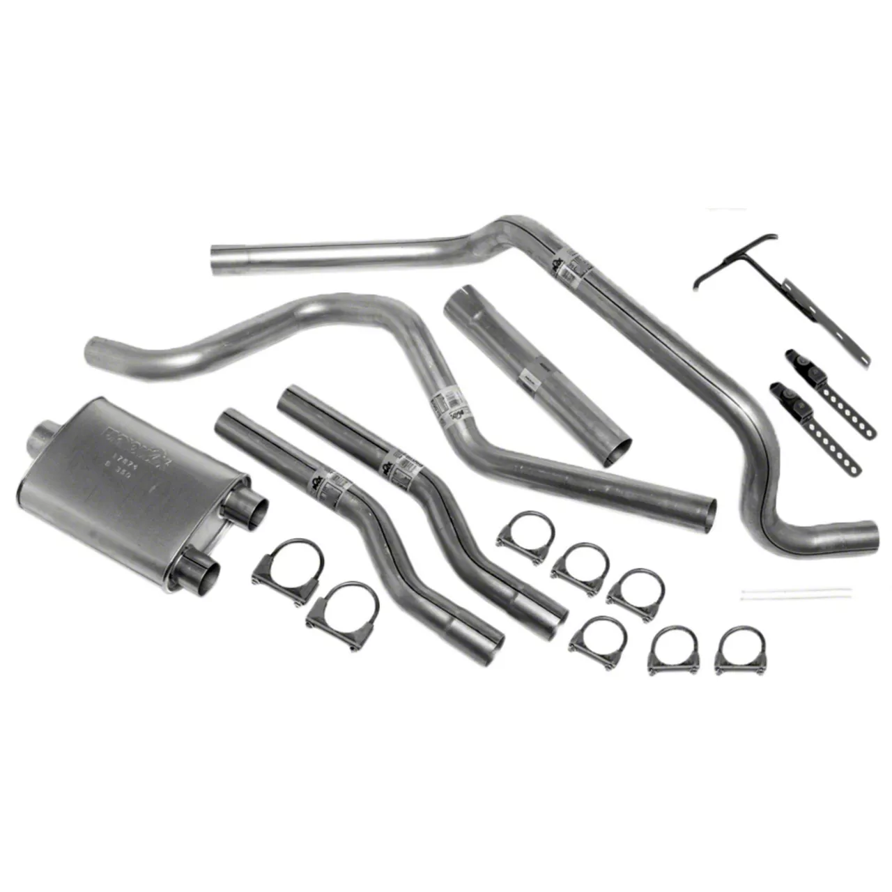 Construction and Appearance. Crafted from high-quality 2.5-inch stainless steel tubing, this exhaust system features a polished chrome finish for durability and a sleek look. It incorporates fiberglass matting technology and large internal flow tubes to enhance flow and minimize drone for a more refined driving experience.