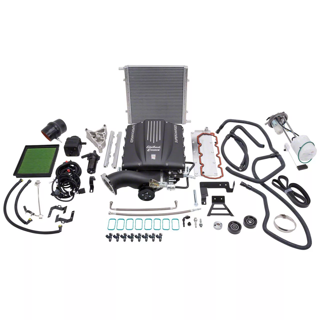 Stage 1 Kit. This E-Force Stage 1 Street Supercharger Kit includes the supercharger unit, high-velocity intake manifold, high-capacity air-to-water intercooler and low-temp heat exchanger, 42 lb/hr fuel injectors, fuel rails, 3.75 inch pulley, hoses, and wiring harnesses. It also comes with a recovery tank, intake tube, air box and air filter. Please note that no tuning device is included with this kit.