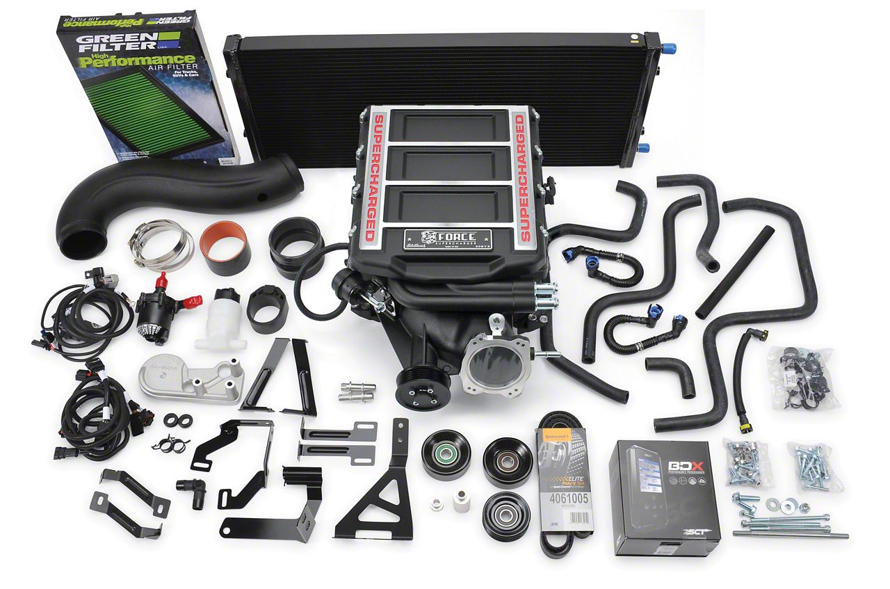 Stage 1 Kit. This E-Force Stage 1 Street Supercharger Kit includes the supercharger unit, high-velocity intake manifold, high-capacity Dual Pass 3-core intercooler and low-temp heat exchanger, 3.875 inch pulley, hoses, and wiring harnesses. It also comes with an intake tube and air filter. Please note that no tuning device is included with this kit.