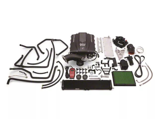 Complete Kit. This E-Force Stage 1 Street Supercharger Kit comes complete and includes the supercharger unit, high-velocity intake manifold, high-capacity air-to-water intercooler and low-temp heat exchanger, 4.125 inch pulley, hoses, and wiring harnesses. It also comes with an intake tube and air filter. A handheld programmer with Edelbrock calibration is also included for easier tuning.Edelbrock 1564
