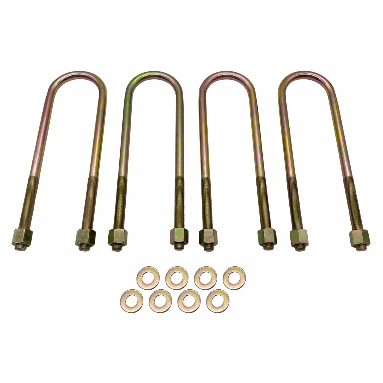 Construction and Appearance. Each U-bolt is precision-formed with an 11" x 2.625" x 9/16" round design and finished with a gold zinc plating for superior corrosion resistance. Built for compatibility with vehicles using rounded OEM U-bolts, the kit includes all necessary hardware for installation. Durable and purpose-built, these U-bolts are not compatible with monoleaf spring setups.