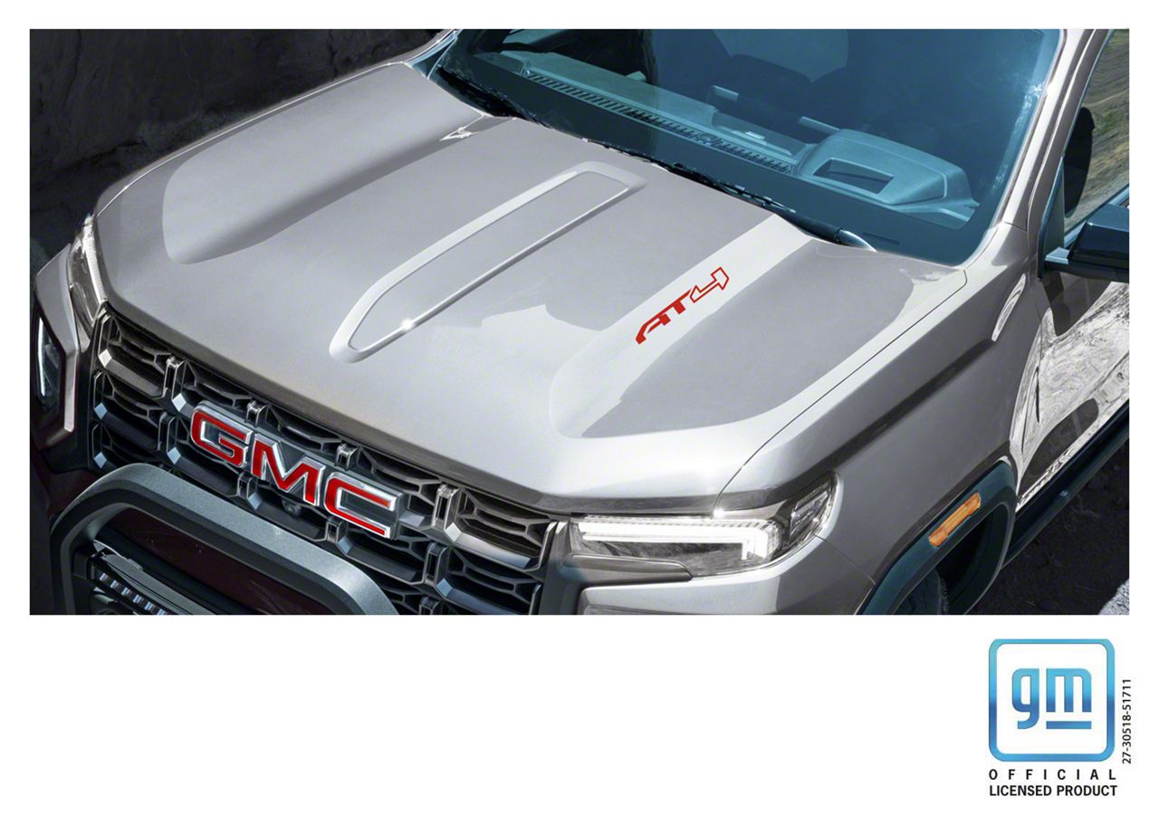 Set of 2 Canyon AT4 Hood Lettering decals. Color is Red. Decals get installed on side hood contours. You get a Left-side and Right-side decal. Decals have pre-applied application film. Decals come with preparation, positioning and installation instructions. Fits on all Canyon AT4 model Years 2023 thru 2025. General Motors official Licensed Product.