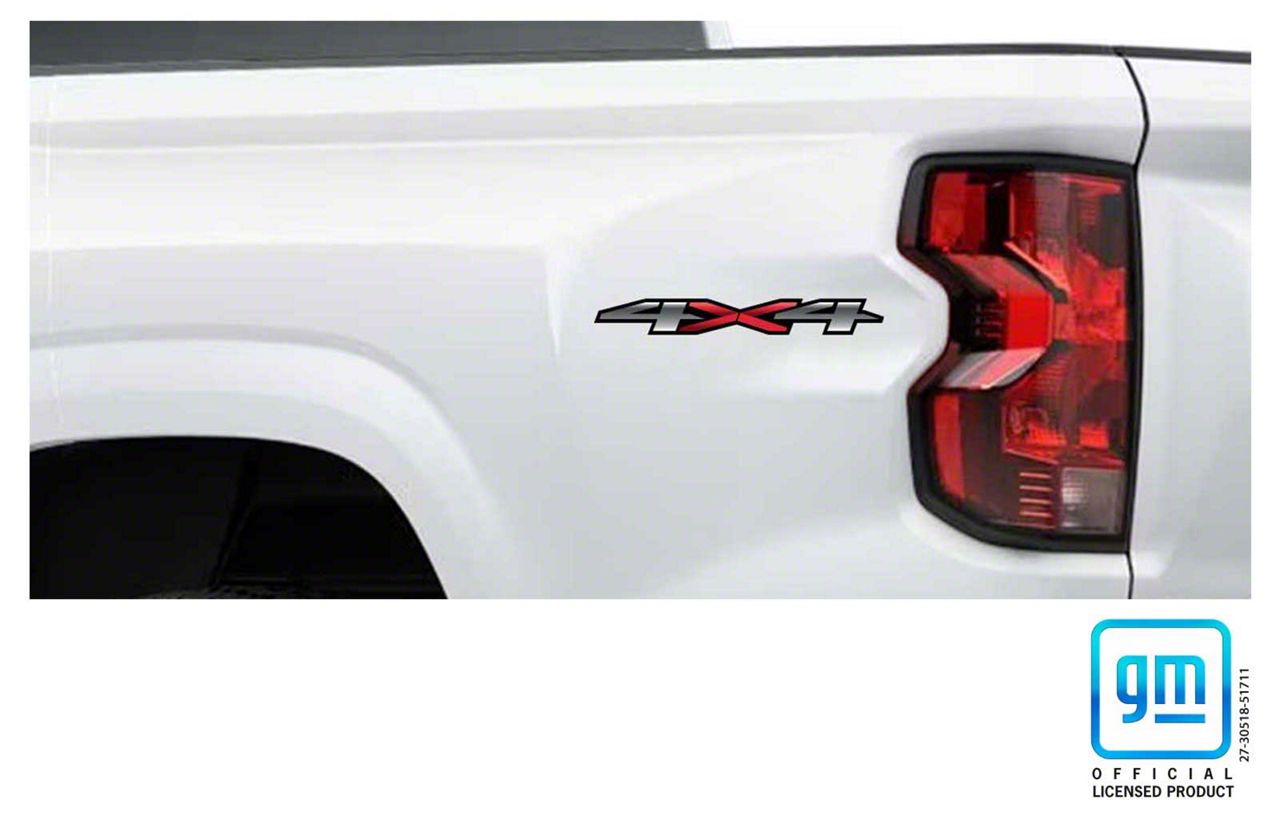 Application. This Emblems Plus 4x4 Bedside Decals (Red/Silver/Black) fits 2023-2026 Chevrolet Colorado models.
