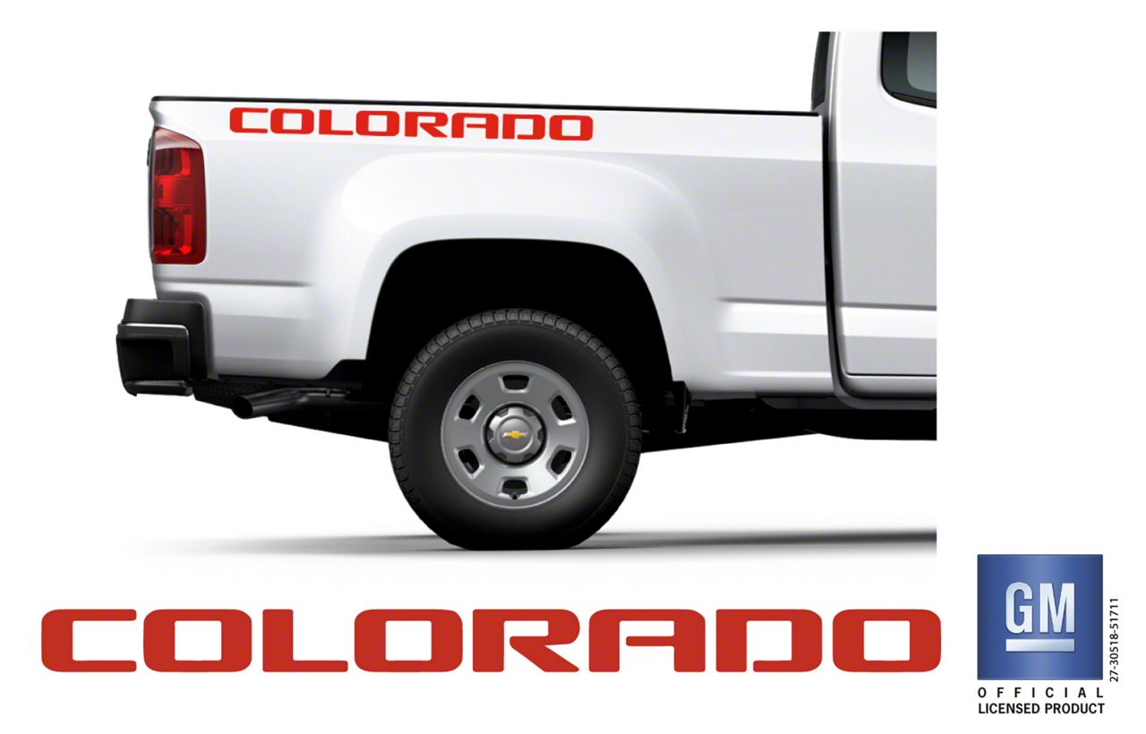 Bold Red Lettering. The Chevrolet Colorado Red Bedside Lettering Decals Set provides a distinctive styling upgrade for your truck's exterior. Designed to enhance the bed sides, these decals increase visual appeal while showcasing authentic branding. They deliver a sleek, professional look suitable for enthusiasts who want to maintain an OEM appearance with vibrant accents.