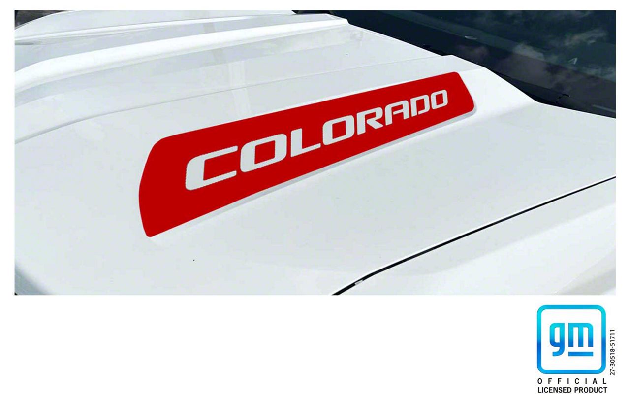 Distinctive Hood Decals. The Chevrolet Colorado Red Colorado Hood Decals Set of 2 enhances the visual appeal of your truck by adding bold, red lettering to the hood that allows the vehicle's original color to show through. This styling element is designed to give a customized look while maintaining a professional appearance. It is ideal for owners seeking to highlight their Chevy Colorado with a unique, factory-approved accent.