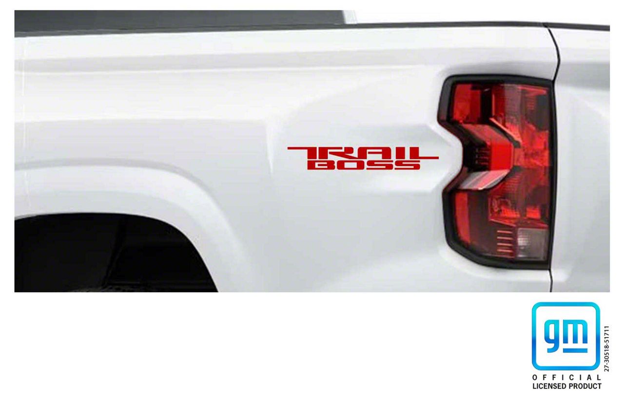 Application. These Emblems Plus TRAIL BOSS Bedside Decals in red fit 2023-2026 Colorado Trail Boss models.