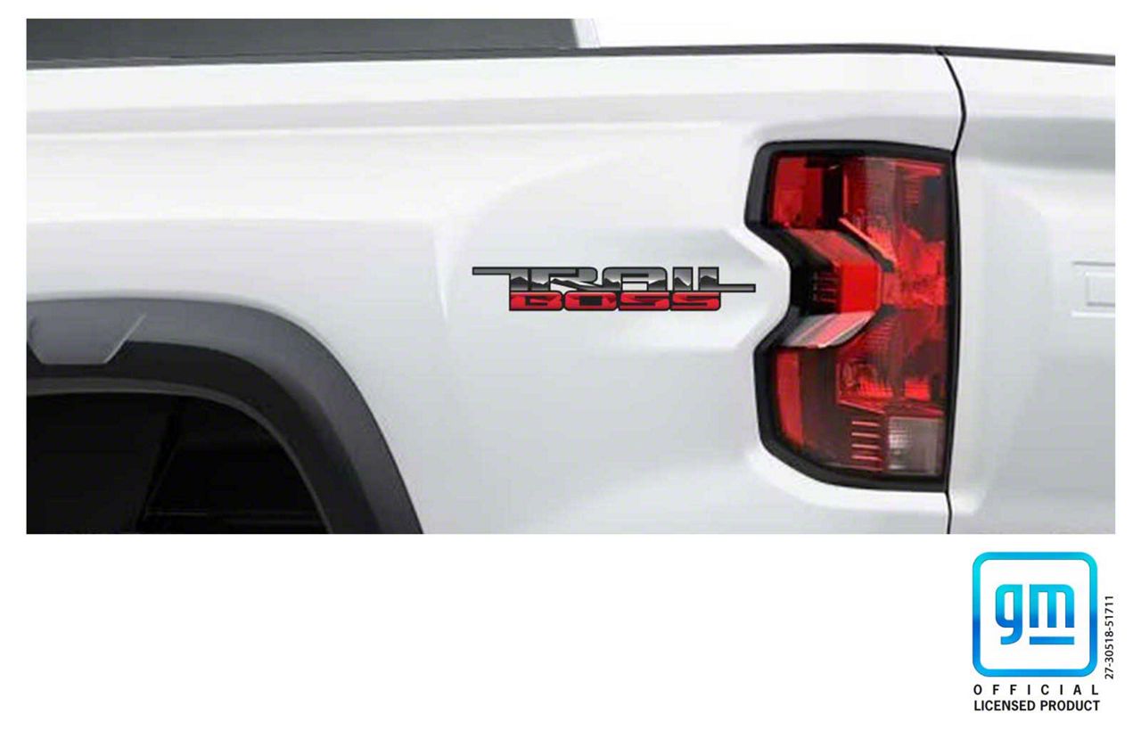 Application. The Emblems Plus TRAIL BOSS Bedside Decals; Red/Grey/Black/Silver fit 2023-2026 Colorado Trail Boss models.