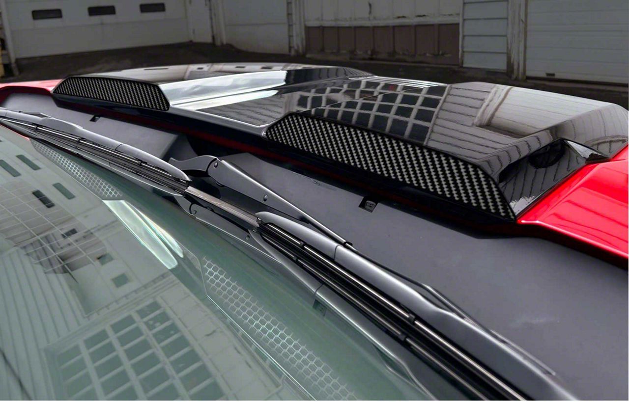 Construction and Appearance. Each decal is crafted from high-quality vinyl, ensuring long-lasting durability and resistance to weathering. The surface features a carbon fiber finish that adds a modern, aggressive look to your vehicle. Precision manufacturing ensures clean lines and an exact fit on the designated rear hood scoop area.