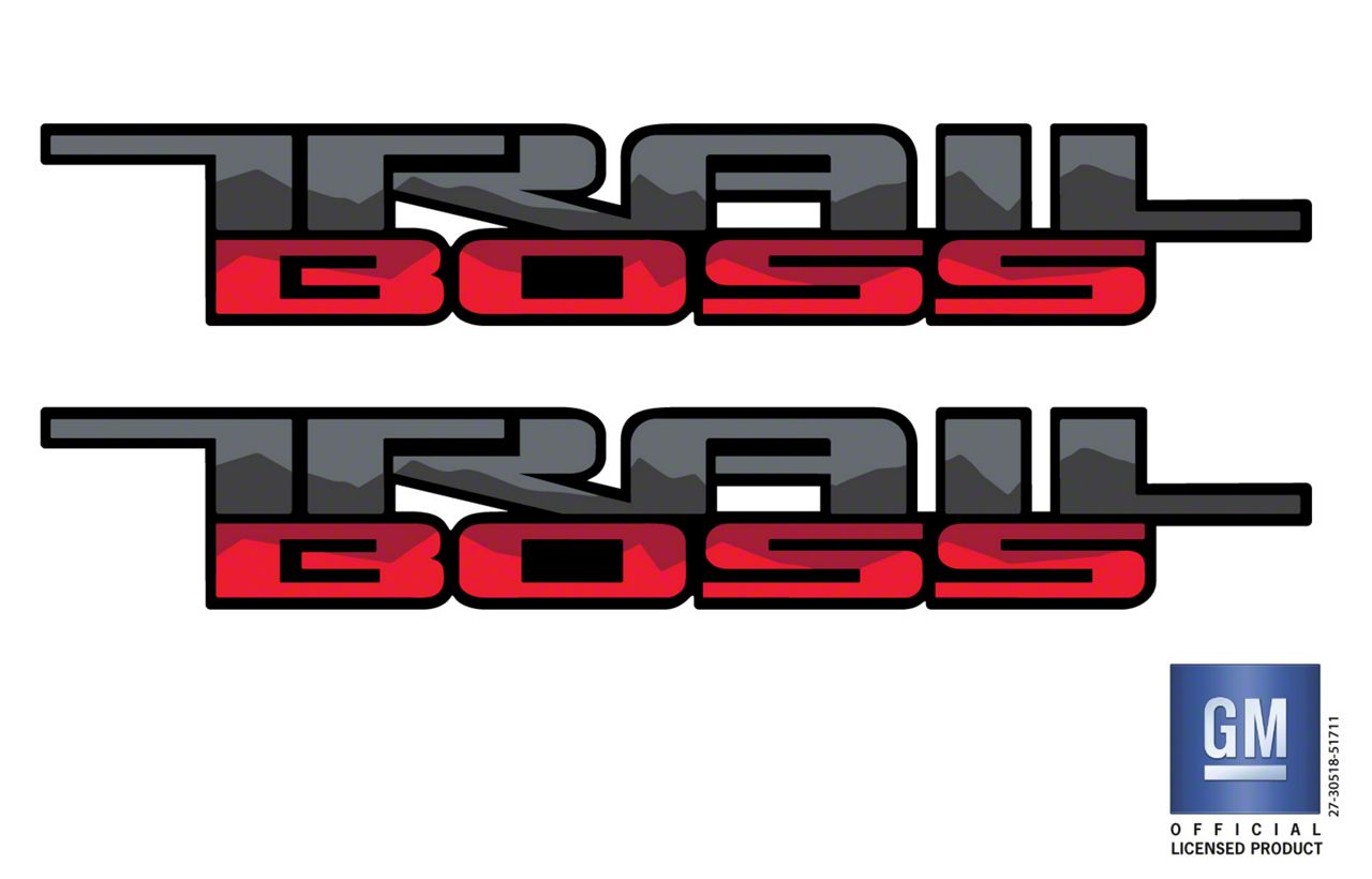 Application. The Emblems Plus Trail Boss Bedside Decals; Red/Gray/Black fit 2019–2026 Silverado 1500 Trail Boss models.