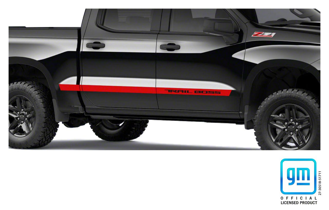 Construction and Appearance. Crafted from high-quality automotive vinyl, these decals offer long-lasting durability and resistance against weather and fading. The Racing Red finish provides a bold contrast against your truck’s body, ensuring the Trail Boss logo stands out. Each piece is precision-cut to ensure a clean, OEM-like fit that complements the Silverado's contours.